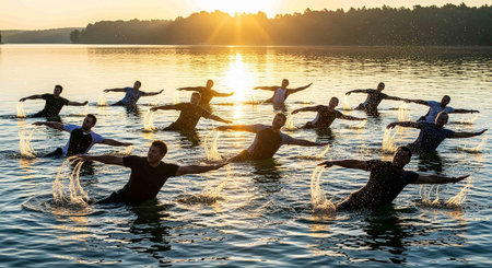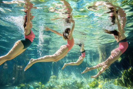 Swimmers glide through crystal clear water, showing synchronized movements and joyful expressions.