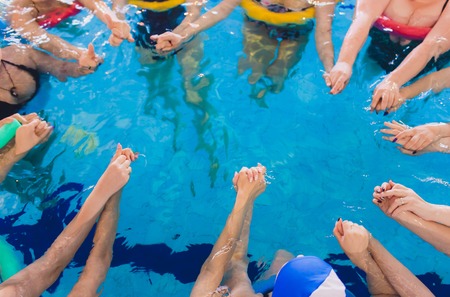 women trains in aqua aerobics, learn to swim. circle team hands