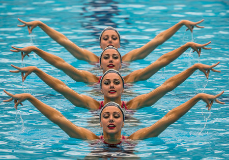 Synchronized swimmers hands in perfect alignment demonstrate coordination at summer olympics