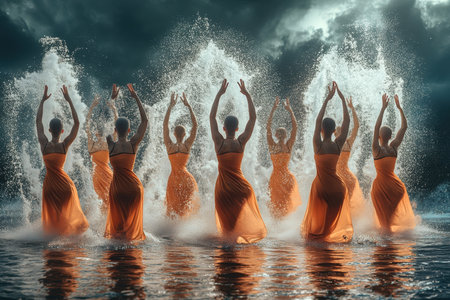 Dancers in orange dresses gracefully move in water, creating splashes beneath a moody, cloudy sky.