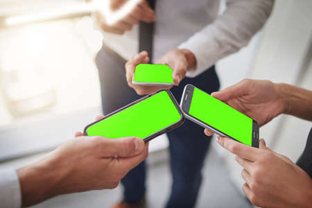 close-up screens phones in the hands of men and women