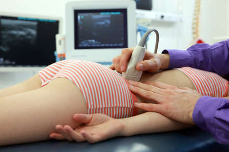 Closeup of man getting an ultrasound scan on abdominal by doctor.