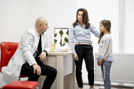 Pediatric orthopedist talking with a little girl and her mom during medical appointment at the office. Concept of pediatrics and examination musculoskeletal childs system