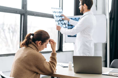 Close-up of mature adult male physician consult scared young man patient giving bad news explaining results of MRI image. Unhappy frustrated young man listening to bad news sitting in doctor office.