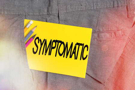 Writing note showing Symptomatic. Business concept for serving as symptom or sign especially of something undesirable Writing equipment and yellow note paper inside pocket of man trousers