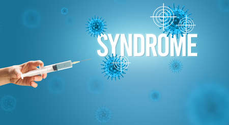 Close-up view of doctors hand in a white glove holding syringe with SYNDROME inscription, coronavirus antidote concept