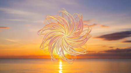 An abstract, glowing floral pattern is centered against a scenic sunset backdrop. The composition features flowing lines and gradients, with warm colors dominating the scene. The image presents a digital artistic style, suitable for various design applications and commercial projects. The landscape suggests a natural environment.