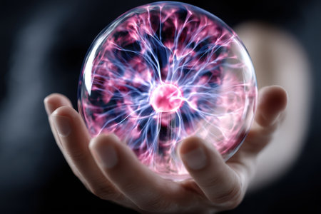 A hand encompasses a vibrant plasma ball, releasing striking electric arcs in a dark environment.