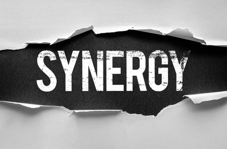 Teamwork, good business system, finding working solutions and effective management. SYNERGY on an unfolded piece of paper
