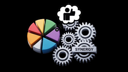 Pie chart and gears generating synergy with positive feedback on transparent background