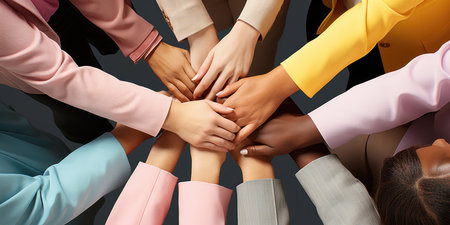 Close up top view of young people putting their hands together. Friends with stack of hands showing unity and teamwork. --ar 16:9 Job ID: c9f6f4df-26f5-477c-91f8-063c7004d700