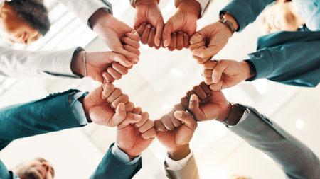 Fist bump, below and business people in circle for support, mission and team cooperation in huddle. Corporate community, solidarity or synergy with group for partnership, agreement and hands together