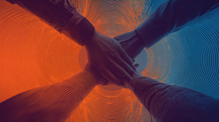 This vibrant image captures the essence of teamwork and unity through hands joining together, highlighted by an engaging colorful circular pattern, symbolizing collaboration.