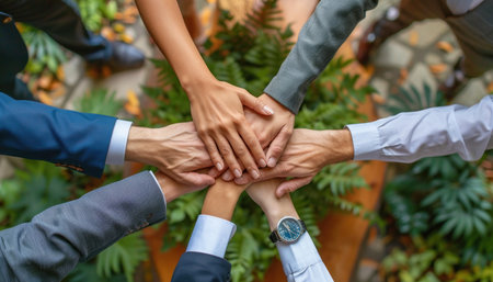 Diverse hands symbolizing teamwork, empathy, partnership, and social connection in business