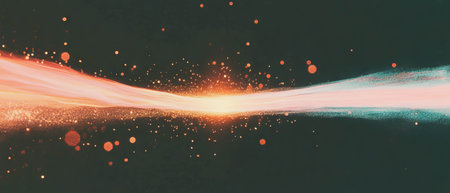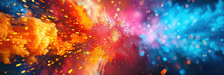 A captivating burst of color and light spreads from a corner, featuring dynamic lines that combine with shimmering particles to create an abstract spectacle.