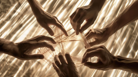 Photo shows hands weaving strings together, forming an intricate web. Metaphor of various connections between people through communication, help, love, care