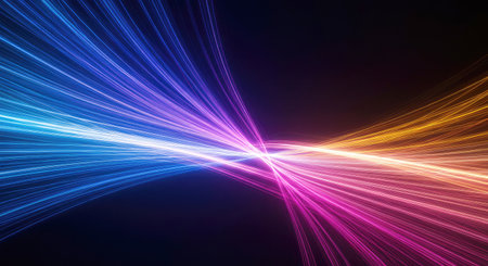 An abstract illustration displays vibrant energy waves extending outwards. The artwork showcases flowing lines in diverse colors, emitting from a central bright point. The composition uses dynamic forms with blurred bokeh effects. It is well-suited for various commercial and editorial applications, offering a dynamic visual element.