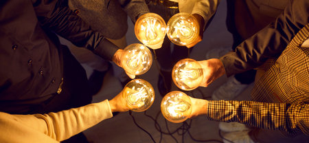 Creativity. Top view of group of unidentified people holding six glowing light bulbs and connecting them together. Concept of idea, innovation and inspiration. Web banner.