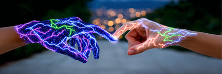 Two hands reaching towards each other with glowing neon lightning effects, symbolizing connection and futuristic energy