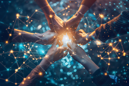 A group of hands from diverse individuals come together, illustrating collaboration and unity, surrounded by a shimmering, glowing network of light in a creative blend of colors.