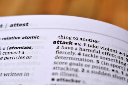 English Definition Dictionary Page Close Up Of Printed Word Of -attack