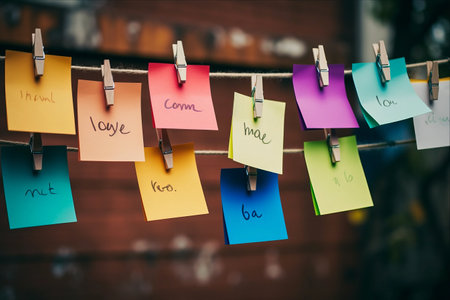 close up various colorful English vocabulary on white background