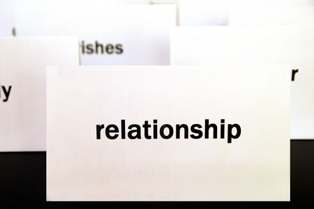 Word Relationship on a white paper card surrounded by other words. Priorities and values concept
