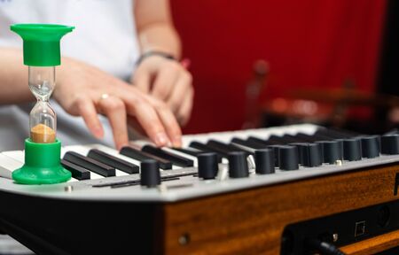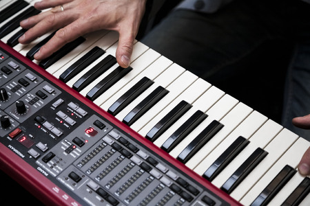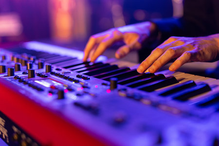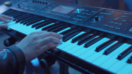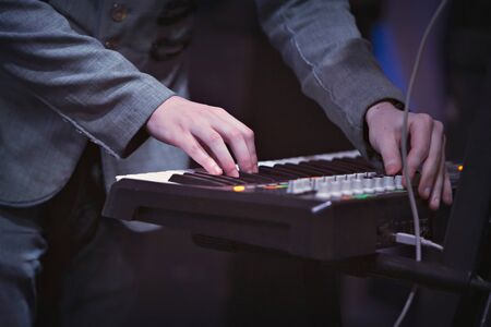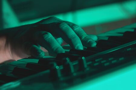 Hand of A pianist or keyboardist of a rock band close up playing a synthesizer. Selective focus