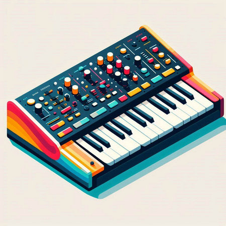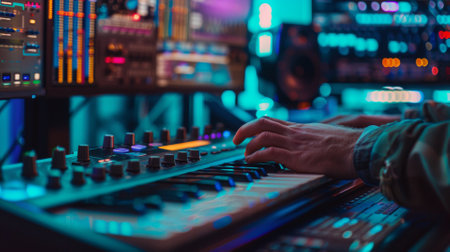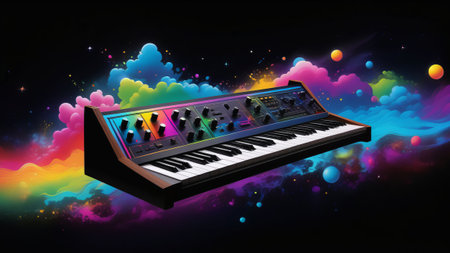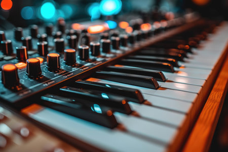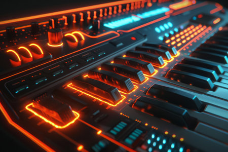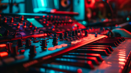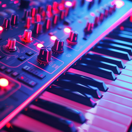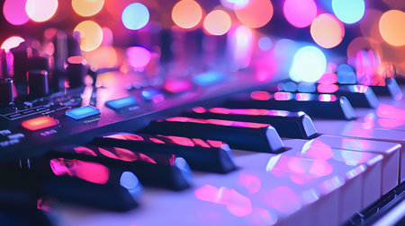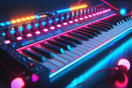 A vivid close-up of a synthesizer keyboard featuring colorful neon lights and intricate controls, set in a modern music studio, highlighting creativity and sound exploration.