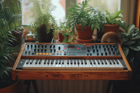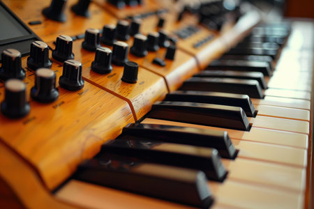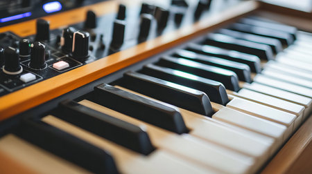 This close-up shows a vintage synthesizer keyboard with black and white keys and various controls. The attention to detail highlights its musical potential and retro design