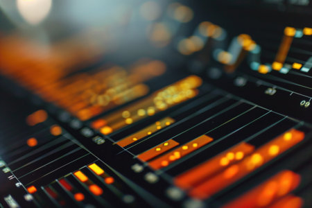 Close-up of electronic sound mixer controller in nightclub. Selective focus