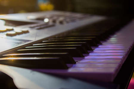 Close up of electronic piano keyboard with colorful bokeh background.