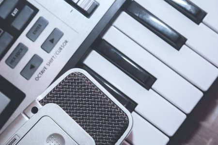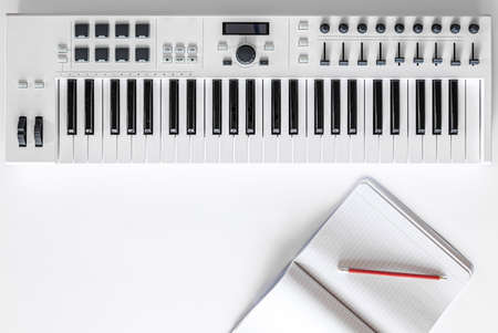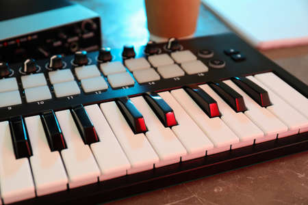 Musician workplace with midi keyboard, close up