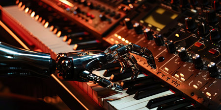 Robot hand on synthesizer, close-up. 3d rendering