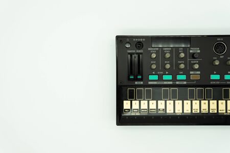 Black analog Fm synthesizer with knobs and keys. Audio equipment for musical production. Sound recording studio device for musician. Isolated on white background. Music concept.