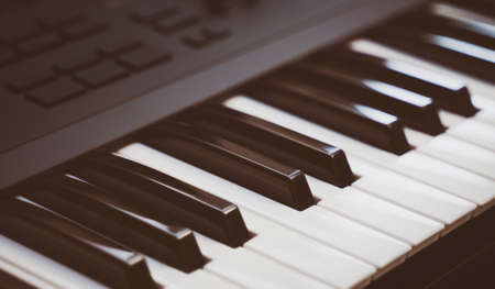 Close up of piano keys on blurred background with bokeh.