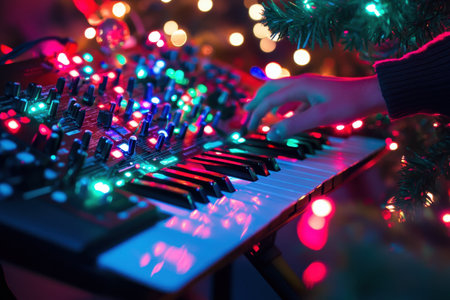 A musician plays a vibrant synthesizer adorned with multicolored lights during a festive celebration.