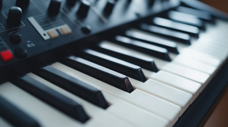 A detailed close-up view of a MIDI synthesizer controller showcasing the keys and controls, perfect for representing music technology and creativity.