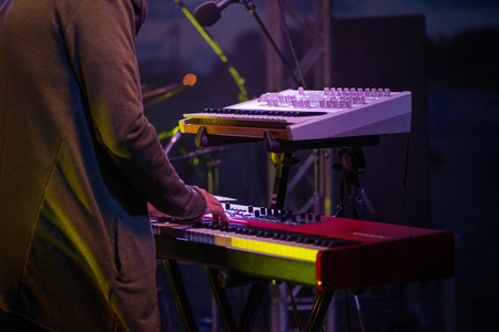 Male musician plays a musical instrument on the stage. Artist playing on the keyboard synthesizer piano keys. Live concert of choir music at night in summer festival. Colorful, abstract lights
