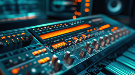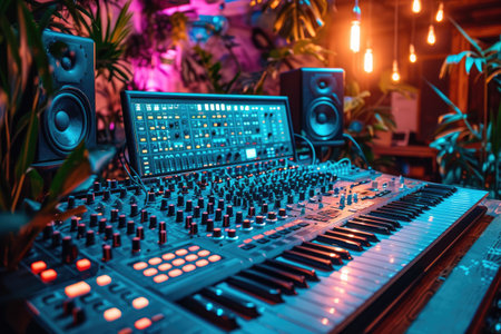 Detailed view of music studio equipment with vibrant LED lights on a synthesizer and sound mixer