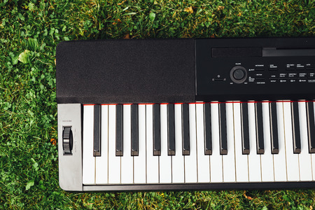 part of electric piano keyboard, green grass background