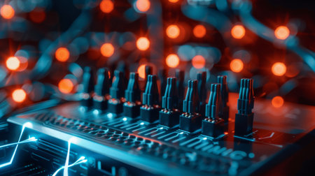 A digital sound mixer is showcased in a music studio with illuminated controls and a waveform display. The ambient lighting creates a focused atmosphere for audio production.