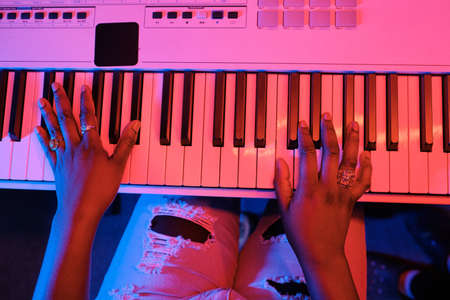 Top-down view of unrecognizable African American musician playing digital keyboard in recording studio, neon lighting