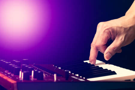 male musician hand playing on synthesizer keyboard. music background
