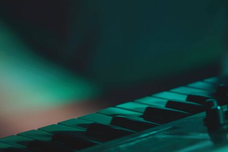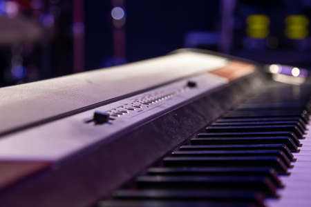 Part of the keyboard of a synthesizer standing on the stage during a performance. Selective focus