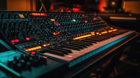 Colorful synthesizer with illuminated buttons sits in a stylish recording studio, perfect for music production, sound design, and inspiring creativity in musicians.