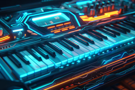 A futuristic synthesizer with glowing neon lights AI generated