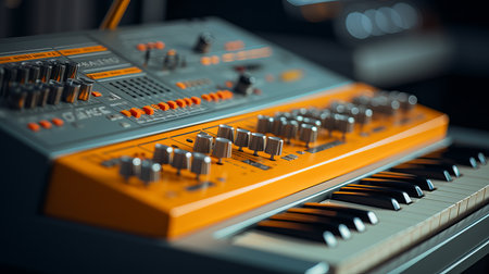 In a lively music studio, an orange vintage synthesizer sits prominently, ready to produce captivating melodies. Various knobs and keys hint at endless creative possibilities.