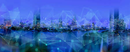 Wireless network and Connection technology concept with Abstract Bangkok city background in panorama view