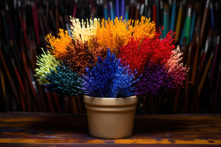 paintbrushes with different colored tips facing each other in a pot, created with generative ai